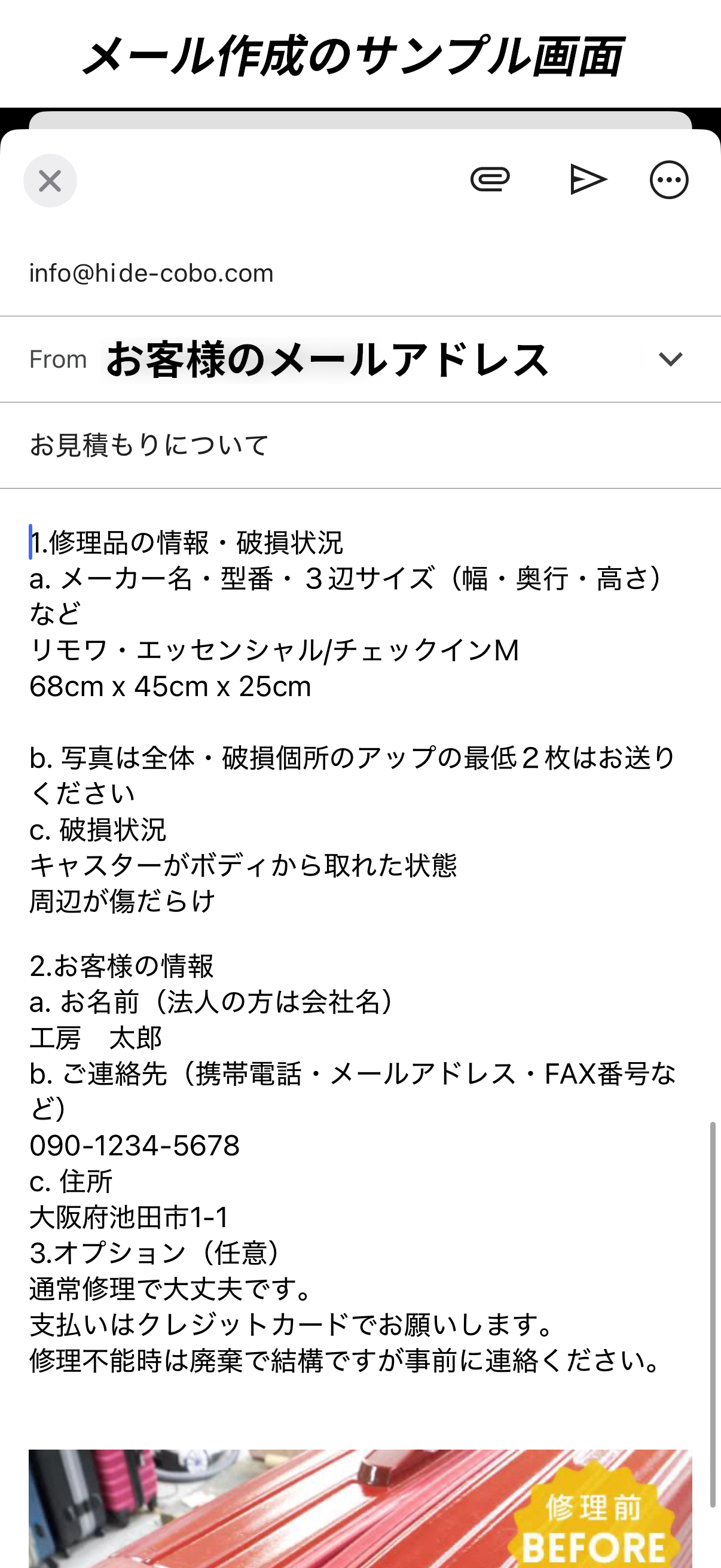 「修理品全体」及び「破損個所のアップ」の、最低2枚以上の写真画像を送ってください。